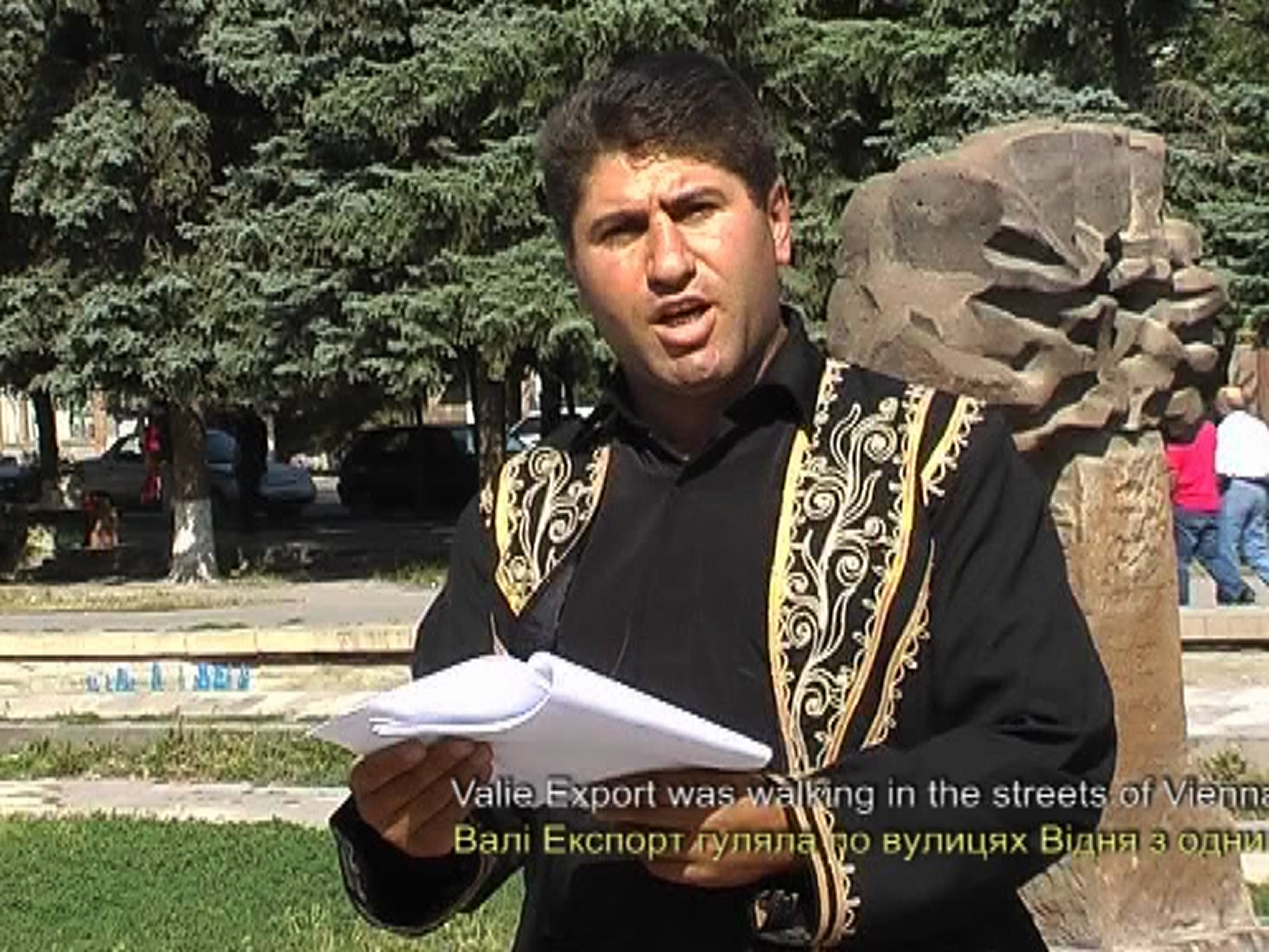 The video installation Mediators includes documentation of six street performances carried out by R.E.P in Kyiv (Ukraine), Gyumri (Armenia), Almaty (Kazakhstan), Plovdiv (Bulgaria), Schwaz (Austria) and Byalystok (Poland).