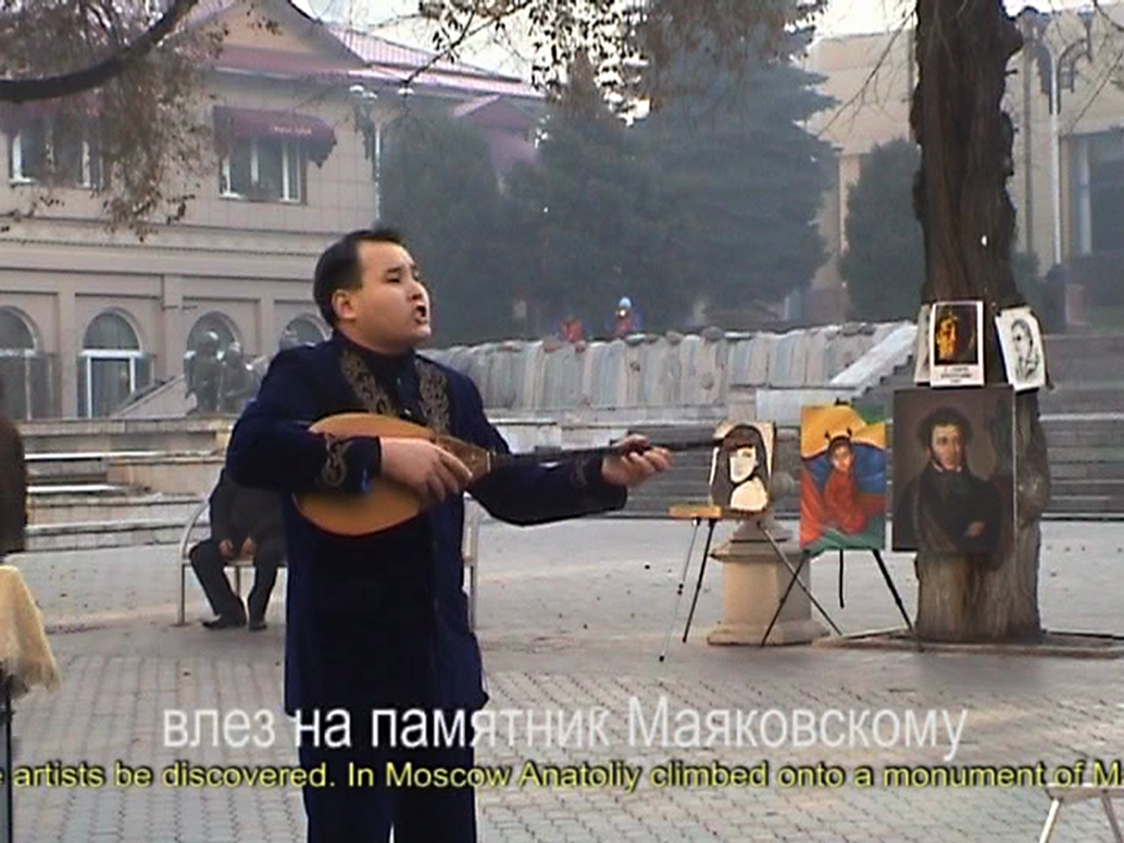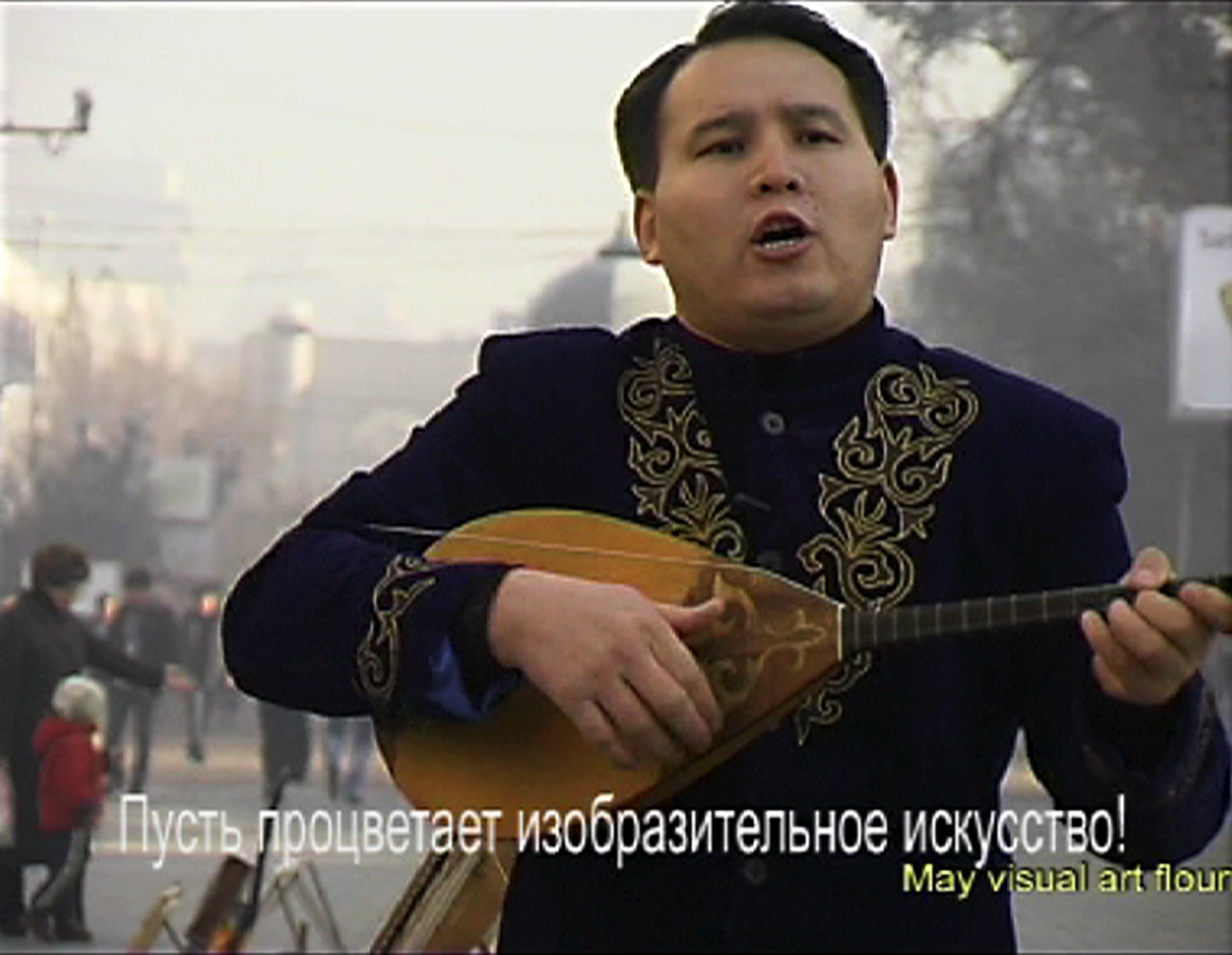 In the video Akyn (2009), the singer describes the most radical performances by contemporary artists from different countries – Alexandr Brener, David Levine, Anatoly Osmolovsky, Elena Kovylina and Maxim Ilyukhin, Natalya Dyu.